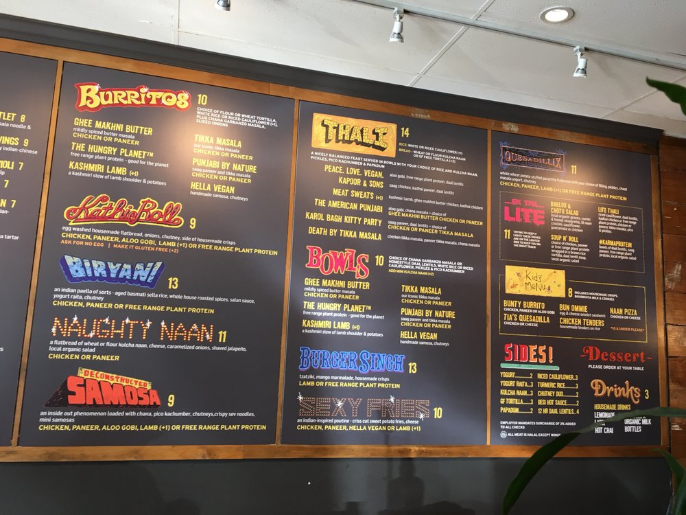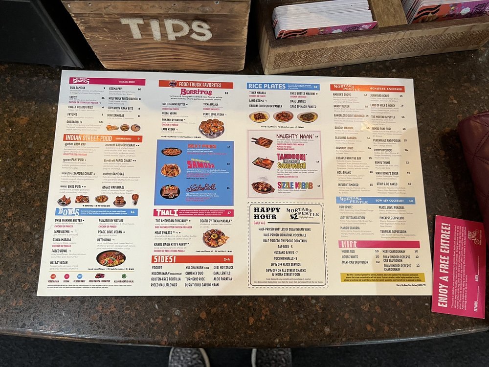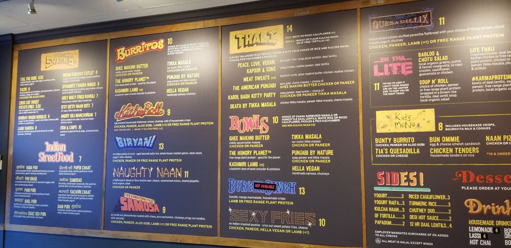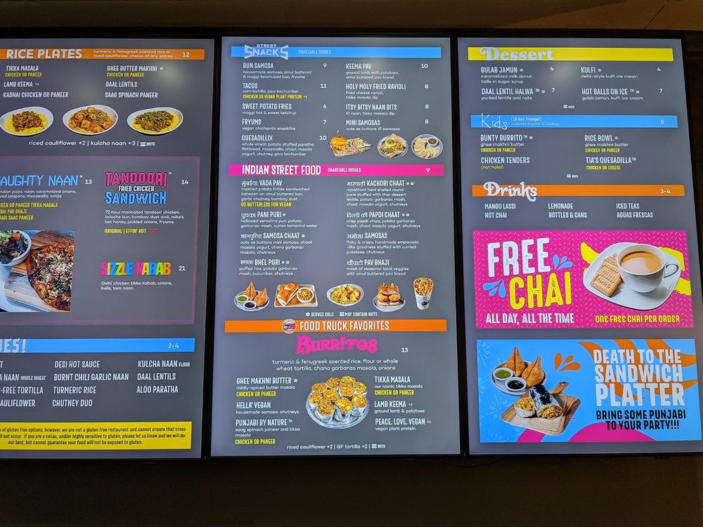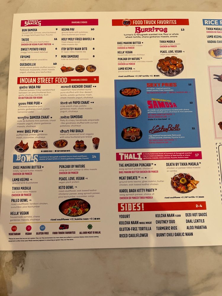 “ Good fusion Indian food. The store is nice and clean. The staff are very nice and friendly. They gave us more time to look at the menu when we were still indecisive, offer small spoon for toddlers and water refills when asked. The restaurant is well decorated, giving cheerful vibe. Good music addition to enhance the atmosphere. My family had a great time there. The food is also good. We ordered 1 pav bhaji and non vegetarian thali. Ordered 2 hot chai but one was free. The not free one is bigger though. Still a good experience nonetheless. ”