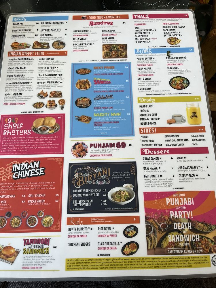 “ We had an amazing experience in curry up now San Francisco. We had planned Tikka Thali, Katti roll, kachiri chat and holy moly fried Ravioli. Had got complimentary tea and biscuits. Amazing food and service. ”